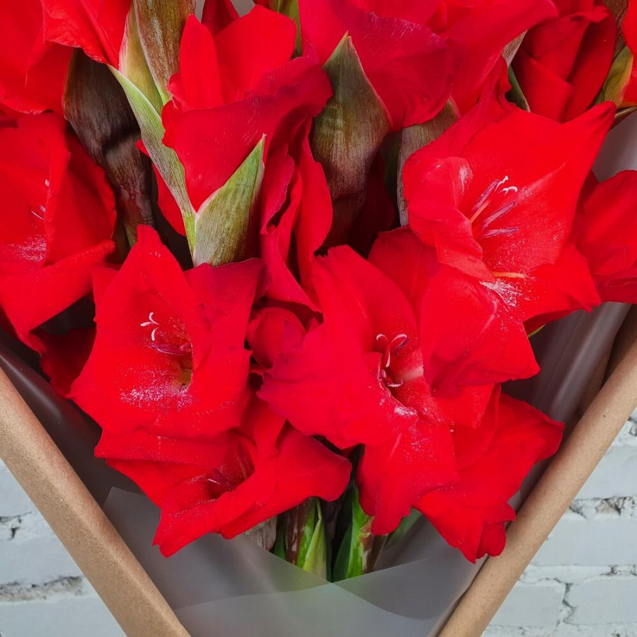 На фото букет 9 красных гладиолусов. В составе: гладиолус 9 шт, крафт-бумага 2 шт, атласная лента 1 шт, . Все цветы свежие и ароматные, букет красиво оформлен и отлично подходит для подарка. Доступна доставка цветов или самовывоз.